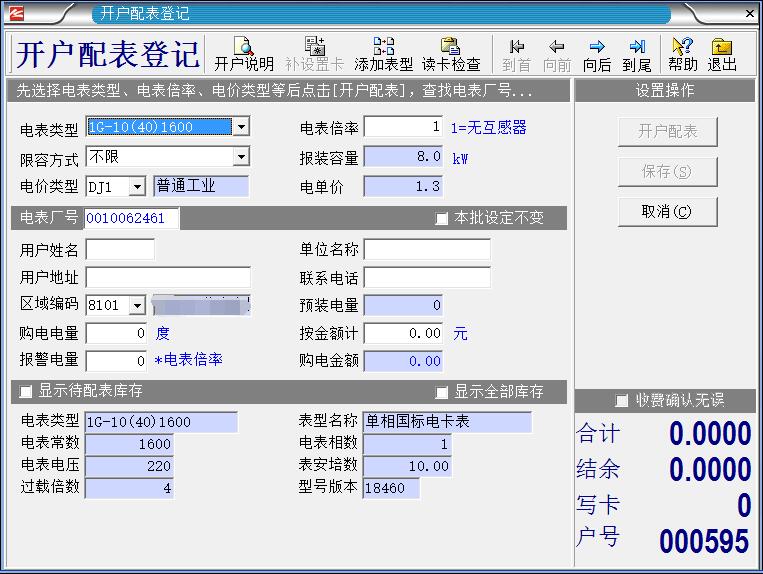 提醒: 只有作了[保存]后该用户的配表数据才进入数据库,在没有保存其中 ‘用户编号’是由系统自动生成带过来的,不能修改。‘开户日期’由系统自动按当前日期处理。 其中:‘电表厂号’的选取必须与电表铭牌上的标识相对应;否则用户购电卡将不能被读入。