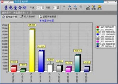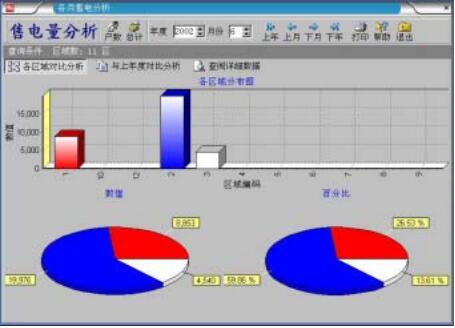 4.5.4 分区售电分析 在分析计算用户用电量时,对用户的用电情况的合理性进行检查;计算出用户月用电量后,对用户月用 电量进行异动分析,分析结果可以形象的以资料列表和多种图形形式显示; 帮助了解当年各月用电量的变化趋势以及与去年同期用电量的对照比较,分析结果可以形象的以资料列 表和多种图形形式显示;查询可按台区线路区域、月份等分类进行,方便输出各类报表;以保证能及时发现用户的异常用电情况并可实施有针对性稽查。 “各区售电分析”对售电区域在一定时间单位内所售电量以及售电笔数进行对照分析;对各区本年度售电量,笔数与上一年度对比分析以及查阅具体信息。在这里可分析出异常情况。主窗口如图所示: 本窗口可在售电量分析与售电笔数之间转换。单击[电量/户数转换]按钮进行转换。当该按钮显示“户数” 时是对售电量进行分析,显示“电量”时,对售电笔数进行分析。当[总计]按钮按下时,是以“年度”为单位,浮 起时以“月份”为单位进行分析。 在“各区域对比分析”中,柱状图显示单位时间内售电量或售电笔数在各区域的分布情况。横坐标表示区 域编号,纵坐标显示单位时间内的售电量或售电笔数;“数值”圆饼图与上面“分布图”相对照,表示对应区域 所售电量或笔数的具体数据。“百分比”圆饼图显示单位时间内,各区售电量或售电笔数在全部售电量或售电 笔数的百分比。 如果要对特定售电区域内的售电情况进行年度比较的话,可以单击“与去年对比分析”标签页。该页默认 情况下显示对首区营业情况的对比分析。可通过工具栏上“首区”、“上区”、“下区”、“末区”等按钮选择要分析的区域编码。“年度分布图”体现指定区域年度各月份的售电情况以及去年同期的售电情况。横坐标表示月份, 纵坐标表示售电量或售电笔数。而圆饼图则是表示本年度的售电情况。 单击“查阅详细数据”: 该页的上半部分用户档案信息。下半部分显示当前用户的购电明细表。可单击选择用户档案表中的记录, 购电明细表立即显示该用户的购电明细信息。也可以单击“到首”,“向前”,“向后”,“到尾”选择用户记录。 在本窗口内,还可以将当前查询所得数据的打印输出。“各月售电量分析”是以月为单位,对本月内每一营业日售电信息的分析。“用户数分析”则是对每一营业 日内发生业务的用户购电笔数进行分析。采用柱状图与数据标注,使您能更直观,更准确地对各时间段售电 情况进行分析。“查阅详细数据”以列表形式列出本月内每一营业日内所发生的总购电量、购电笔数、平均购 电量、购电总金额等详细数据。窗口如图所示:在“年度”、“月份”选择框中输入要查询的年、月。也可以单击工具栏上“上年”、“上月”、“下月”、“下年” 等按钮改变要“年、月”。单击“打印”按钮可对当前查询结果以报表形式进行打印输出。 单击“售电量分析”标签页显示售电量的柱状分析图。其中,横坐标表示时间,纵坐标表示售电量。 同样,单击“用户数分析”标签页显示该月售电笔数的分布图。横坐标代表时间,纵坐标代表营业笔数。